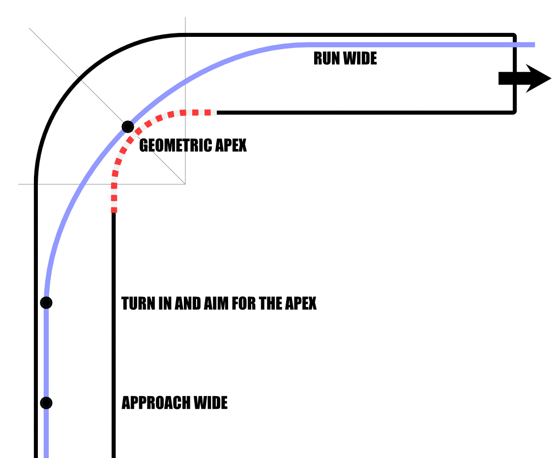 Η βασική γραμμή είναι ανοικτά (είσοδος), πολύ κλειστά(κορυφή) και πάλι ανοικτά (έξοδος). Με αυτήν την τακτική, μπορούμε και μεταφέρουμε αρκετή ταχύτητα γύρω από την στροφή.