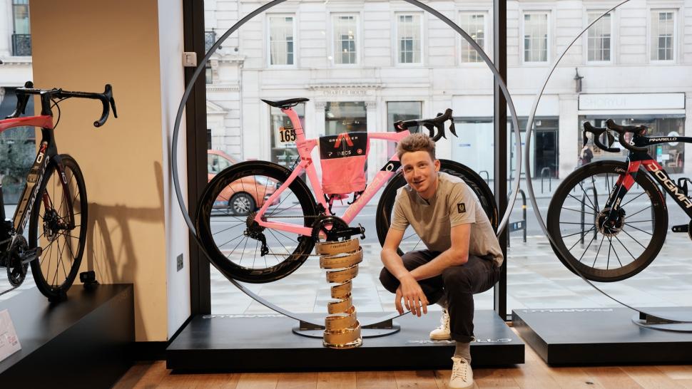 Οι νικητές των Grand Tour αγωνίζονται – συνήθως στο τελευταίο εταπ- με ποδήλατα ειδικά βαμμένα για να ταιριάζουν με τη φανέλα του επικεφαλής της ΓΚ. Στην περίπτωση του Geoghegan Hart, δεν φόρεσε ποτέ τη ροζ φανέλα μέχρι το τελικό βάθρο του Giro d’Italia, και έτσι δέχτηκε μια έκπληξη σε ένα κατάστημα της Pinarello στο Λονδίνο.